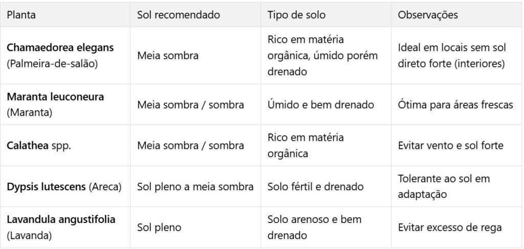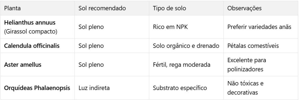 Prefira solo bem drenado, escolha plantas adequadas ao clima da sua cidade — verifique sol (pleno/parcial/sombra) e proteção contra vento ou frio.
